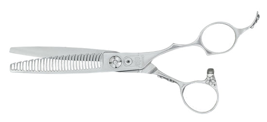 • Top quality thinning shear, 15 teeth, model F handles (offset / medium weight / smaller finger opening than the D model / engraved floral design on the handls) 6''